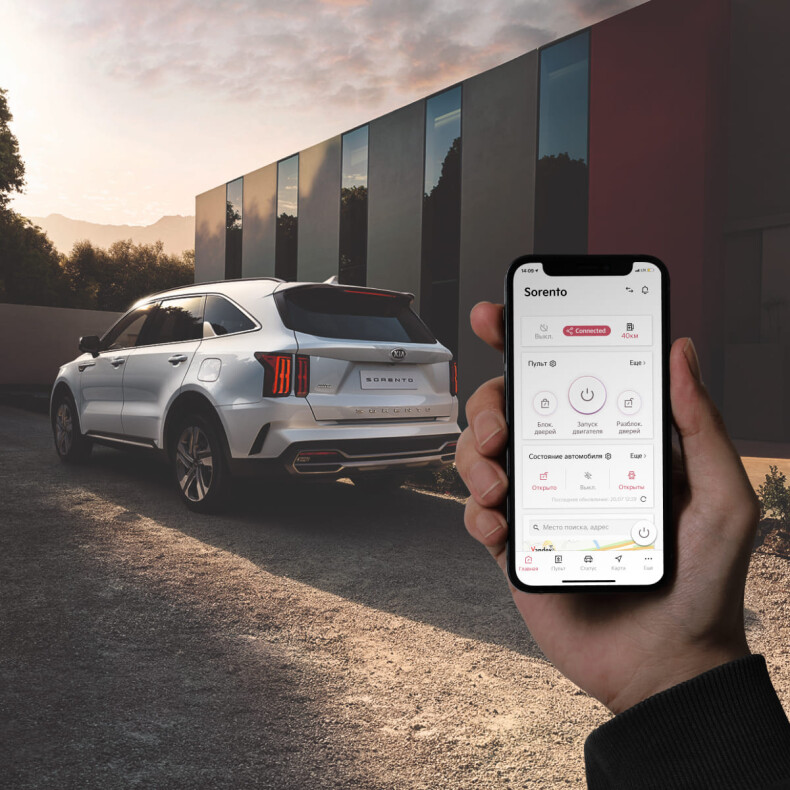 Вы cможете использовать приложение Kia Connect, чтобы быстро отыскать свой автомобиль или найти место назначения, заправочную станцию или ресторан. Кроме того, у Вас появится возможность отправлять пункт назначения в навигационную систему автомобиля прямо из приложения Kia Connect в вашем смартфоне. Также Вы сможете дистанционно завести двигатель, настроить климат-контроль, чтобы прогреть или охладить салон автомобиля, включить подогрев или вентиляцию сидений, подогревы руля, стекол и зеркал. У Вас появится быстрый доступ через телефон к важной информации об автомобиле, такой как статистика о вождении, состояние систем автомобиля, срабатывание сигнализации.